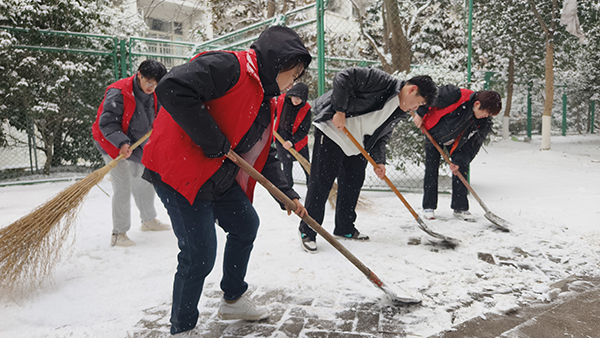 ? ? ? ?活動中,凜冽的寒風(fēng)不能阻擋學(xué)校志愿者們高漲的熱情,大家有序到達指定地點揮動鐵鍬、舞動掃帚、齊心協(xié)力、分工合作、配合默契,鏟的鏟、掃的掃,干勁十足。盡管頭頂上鵝毛大雪紛飛,但絲毫沒有影響志愿者們的清理效率。鐵鍬與地面摩擦的“呲呲”聲,掃帚與地面接觸的“沙沙”聲,此起彼伏,大家一起體驗著勞動的快樂,感受著合作的幸福,用實際行動弘揚了“奉獻、友愛、互助、進步”的志愿服務(wù)精神。經(jīng)過連續(xù)奮戰(zhàn),志愿者們清掃了學(xué)校門前道路的積雪,又延伸到了教學(xué)樓和宿舍樓門前等多處校園通行必經(jīng)之路,為全校師生開辟了一條洋溢著暖暖溫情的通行之路。