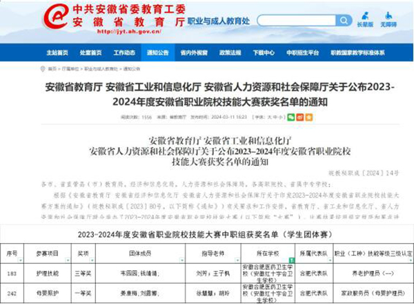 ? ? ? ?3月11日,安徽省教育廳在官網(wǎng)發(fā)布《安徽省教育廳 安徽省工業(yè)和信息化廳 安徽省人力資源和社會(huì)保障廳關(guān)于公布2023-2024年度安徽省職業(yè)院校技能大賽獲獎(jiǎng)名單的通知》,根據(jù)文件精神,安徽合肥醫(yī)藥衛(wèi)生學(xué)校姜康梅、劉露娜,韋園園、錢靖靖四名同學(xué)分別在母嬰護(hù)理、護(hù)理技能學(xué)生團(tuán)體賽項(xiàng)中榮獲一等獎(jiǎng)、三等獎(jiǎng)。同時(shí)根據(jù)有關(guān)文件精神,參賽的兩組四名學(xué)生分別被省人社部門認(rèn)定具備相應(yīng)的專業(yè)技能等級(jí)。