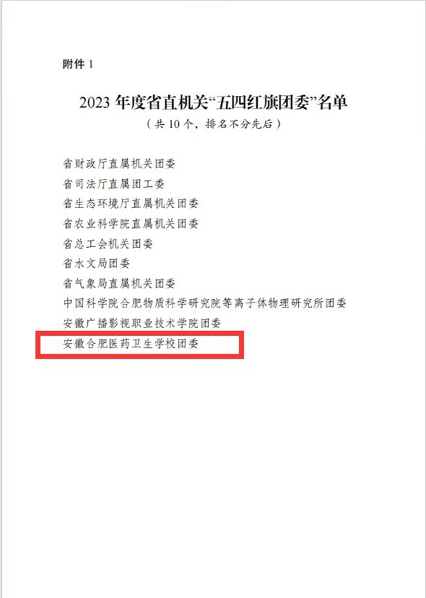 ? ? ? ?近日,安徽省直團(tuán)工委下發(fā)《關(guān)于表彰2023年度省直機(jī)關(guān)“五四紅旗團(tuán)委”、“五四紅旗團(tuán)(總)支部”、優(yōu)秀共青團(tuán)員、優(yōu)秀共青團(tuán)干部的決定》,安徽合肥醫(yī)藥衛(wèi)生學(xué)校團(tuán)委榮獲“安徽省直機(jī)關(guān)五四紅旗團(tuán)委”稱號(hào),尹忠芹老師榮獲“安徽省直機(jī)關(guān)優(yōu)秀團(tuán)干部”稱號(hào),裴世根同學(xué)榮獲“安徽省直機(jī)關(guān)優(yōu)秀共青團(tuán)員”稱號(hào)。
