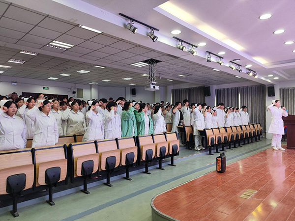? ? ? ?崗前教育大會(huì)中,實(shí)習(xí)就業(yè)處副主任梁益民著重強(qiáng)調(diào)實(shí)習(xí)管理的相關(guān)事宜,對(duì)學(xué)生在實(shí)習(xí)期間紀(jì)律、安全、請(qǐng)假等事項(xiàng)提出具體要求,要求實(shí)習(xí)生在實(shí)習(xí)期間,嚴(yán)格遵守實(shí)習(xí)點(diǎn)操作規(guī)范,認(rèn)真聽取帶教老師的指導(dǎo),同時(shí)叮囑同學(xué)們要做好科室安全防護(hù),并表達(dá)對(duì)實(shí)習(xí)生美好祝福。教師代表?xiàng)钍婢昀蠋煂?duì)同學(xué)們進(jìn)行崗前培訓(xùn)指導(dǎo)。楊老師結(jié)合自身多年帶教經(jīng)驗(yàn),與同學(xué)們分享了自己的成長經(jīng)歷和學(xué)習(xí)方法。最后,實(shí)習(xí)生代表牛妤晗、梁思帆進(jìn)行發(fā)言,她們?cè)诎l(fā)言中表達(dá)了嚴(yán)格遵守學(xué)校、醫(yī)院各項(xiàng)管理規(guī)定,認(rèn)真完成各項(xiàng)實(shí)習(xí)任務(wù),努力提升自己專業(yè)技能,并帶領(lǐng)實(shí)習(xí)學(xué)生進(jìn)行莊嚴(yán)宣誓。