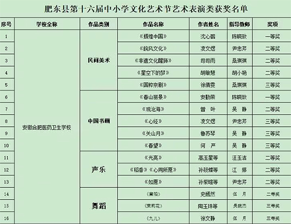 5月27日,肥東縣第十六屆中小學(xué)文化藝術(shù)節(jié)圓滿收官,安徽合肥醫(yī)藥衛(wèi)生學(xué)校在本次藝術(shù)節(jié)中大放異彩,憑借師生們的卓越才華與不懈努力,共榮獲16個(gè)獎(jiǎng)項(xiàng),其中一等獎(jiǎng)2個(gè)、二等獎(jiǎng)8個(gè)、三等獎(jiǎng)6個(gè),獎(jiǎng)項(xiàng)涵蓋了聲樂、舞蹈、中國書畫、民間美術(shù)等多個(gè)領(lǐng)域,充分彰顯了學(xué)校在藝術(shù)教育方面的深厚實(shí)力與顯著成果。