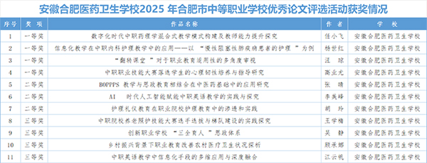 近日,合肥市教育局公布2025年合肥市中等職業(yè)學(xué)?!叭齼?yōu)”比賽結(jié)果,安徽醫(yī)藥衛(wèi)校憑借出色的教學(xué)成果和師生的共同努力,在此次比賽中脫穎而出,喜獲多項榮譽,充分展現(xiàn)了學(xué)校在職業(yè)教育領(lǐng)域的深厚積淀和卓越教學(xué)質(zhì)量。