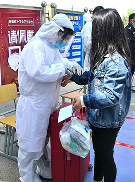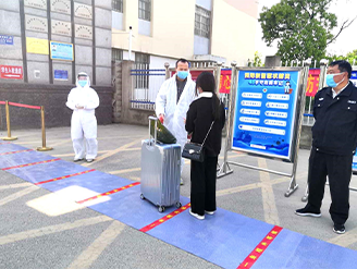 ??4月26日早上,學(xué)校疫情防控工作領(lǐng)導(dǎo)小組全體成員及各班主任、校醫(yī)、后勤工作人員全部到位,為返校學(xué)生提供最貼心的服務(wù)。學(xué)生返校時(shí)都佩戴口罩,保持1米間距,手持家長(zhǎng)和本人簽字的承諾書排隊(duì)入校,經(jīng)入學(xué)檢查工作人員查驗(yàn)“安康碼”、核對(duì)身份、手部消毒、行李消毒、測(cè)量體溫等流程后進(jìn)入校園。在入校檢測(cè)點(diǎn),我們的老師為返校學(xué)生指引規(guī)定的行走線路、幫助學(xué)生搬運(yùn)行李等。
