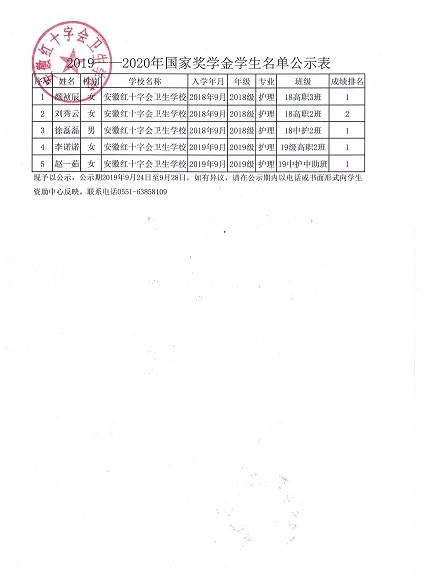 安徽紅十字會(huì)衛(wèi)生學(xué)校2019-2020年度國(guó)家獎(jiǎng)學(xué)金公示
