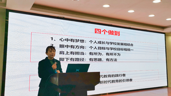 ? ? ? ?洪梅結(jié)合自己和學(xué)校發(fā)展實際,提出了四個做到。她希望全體教職工,心中有夢想,能夠?qū)€人成長與學(xué)校發(fā)展相結(jié)合;眼中有方向,能夠?qū)€人目標(biāo)與學(xué)校目標(biāo)相統(tǒng)一;肩上有擔(dān)當(dāng),要有所為,有所不為,做新時代職業(yè)教育的領(lǐng)路人;腳下有路徑,要有思路,有方法,學(xué)會創(chuàng)新,適應(yīng)新時期職業(yè)教育的要求。關(guān)于2021年的工作,洪梅期望全體教職工能做到“三?!?,即做堅守初心,甘做為生服務(wù)的“孺子?!保蛔龈覟槿讼?,爭當(dāng)創(chuàng)新發(fā)展的“拓荒?!?;做腳踏實地,要做艱苦奮斗的“老黃牛”。