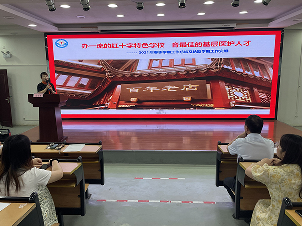 ?????? 7月1日,紅會衛(wèi)校在教學樓多功能廳召開2021年度上半年工作總結暨招生動員大會,校黨總支書記方勁松,校長洪梅,校長助理徐晶晶出席會議,全體教職工參加會議,會議由副校長胡軍健主持。
