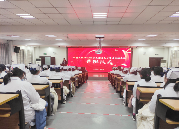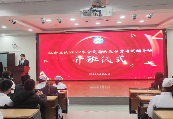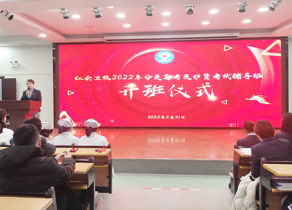 ? ? ? ?2月21日,紅會衛(wèi)校2022年春季學期開學上課第一天,已經(jīng)完成為期8個月實習的部分2017級高職和2019級中專學生再次相聚于學校教學樓一樓多功能廳,共同參加學校2022年分類及護資考試輔導班開班儀式,校長洪梅、副校長胡軍健、各職能部門負責人、輔導班教學團隊成員出席開班儀式,開班儀式由培訓處副主任程姣姣主持。