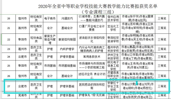 ? ? ? ?9月3日,2020年全省中等職業(yè)學校技能大賽教學能力比賽結果已經(jīng)公示。經(jīng)過校賽的角逐,市賽的競爭,成功晉級省賽,最終由紅會衛(wèi)校沙雯、劉芳、胡玲、楊世紅四位老師組成的參賽團隊成功榮獲該賽事專業(yè)課程組省賽三等獎。